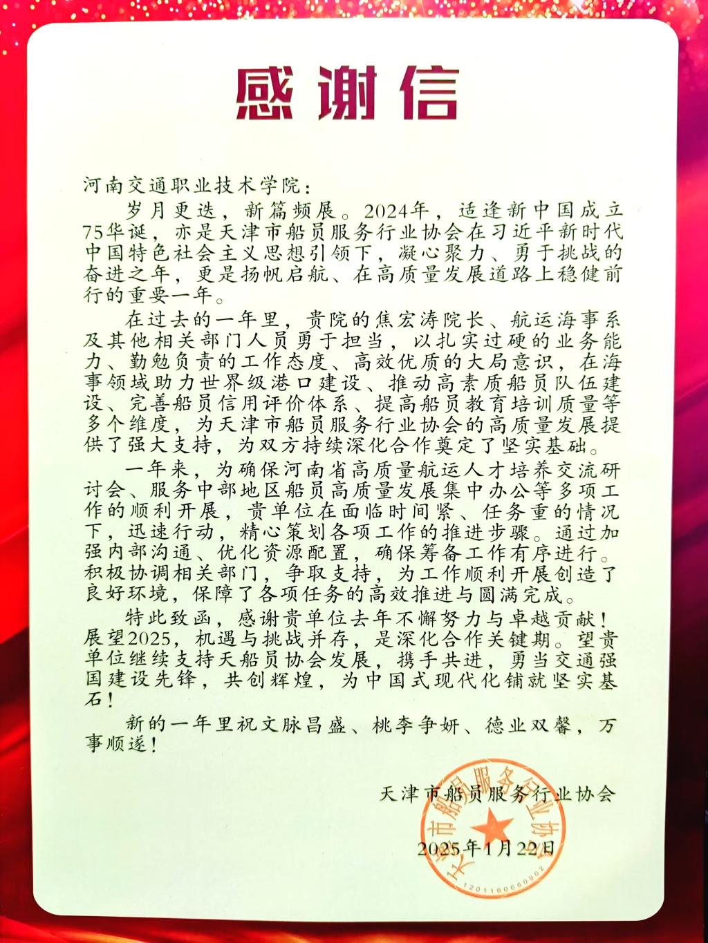 信中说,过去一年,河南交通职业技术学院校领导、相关职能部门和航运海事系人员勇于担当,以“专业、务实”的工作态度,积极参与创新高素质船员培养模式、完善船员信用评价体系、提高船员教育培训质量等多项工作。在承办“河南省高质量航运人才培养交流研讨会”、组织“服务中部地区船员高质量发展集中办公”等任务中,学校展现出优秀的组织能力,为天津市船员服务行业协会的高质量发展提供了强大支持,为双方持续深化合作奠定了坚实基础。